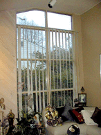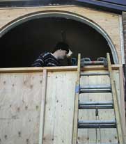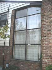 After removing the old rotted frame and glass, The new vertical frame members are installed.Plywood is put in temporarily untill the glass can be manufactured.
