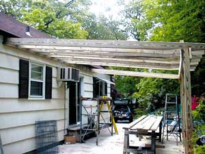 | As you can see there is no cover from the trees or bugs. | The first step is to lag bolt a header with joist hangers to the House | |